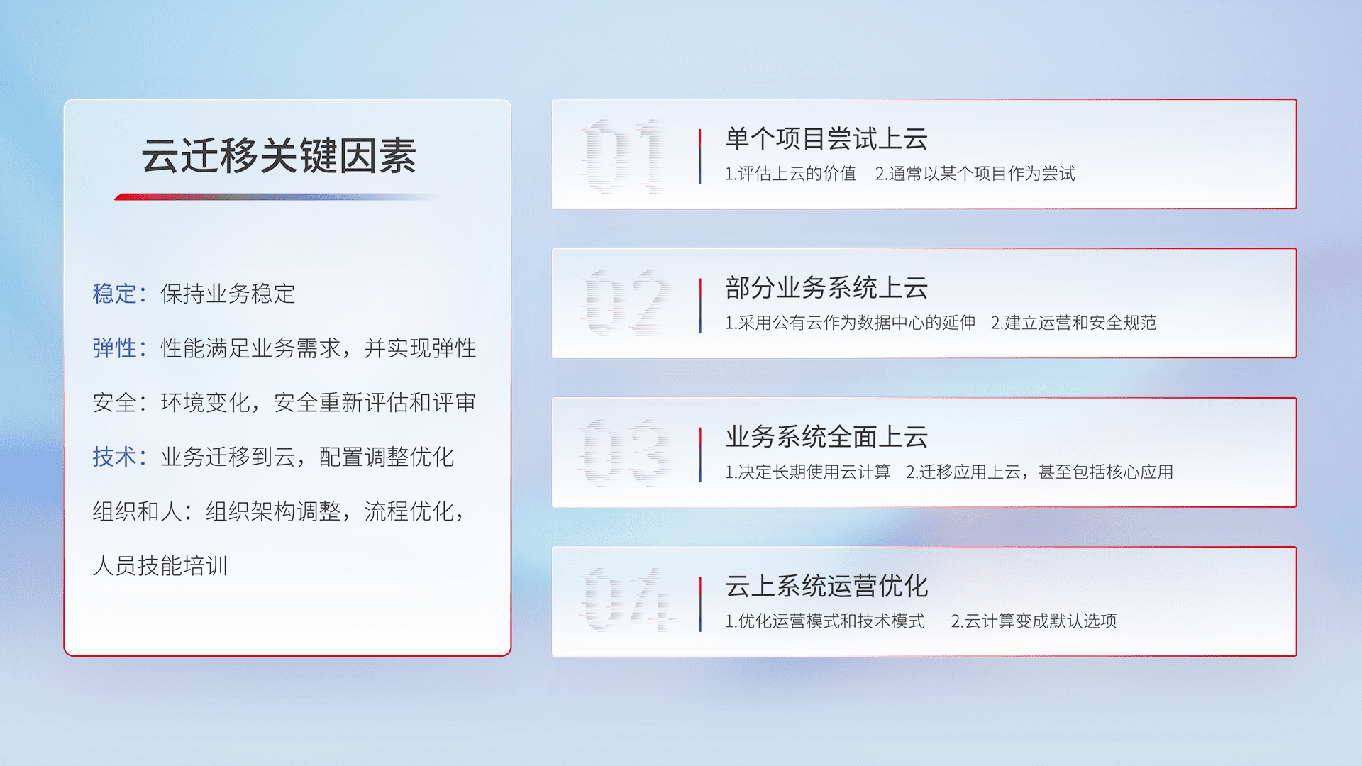 结合实际业务,,从规划设计、、云平台选型、、、云原生改造、、数据迁移、、、、集成交付,,,迁移全过程为客户识别最佳上云路径,,做好风险识别管理,,设计网络架构、、身份权限、、安全审计合规、、、、操作审计、、、日志审计、、、监控告警策略、、、多站点容灾设计等,,,,对云上基础设施进行整体规划,,提升IT治理水平,,以满足弹性、、高可用、、高性能的需求。。